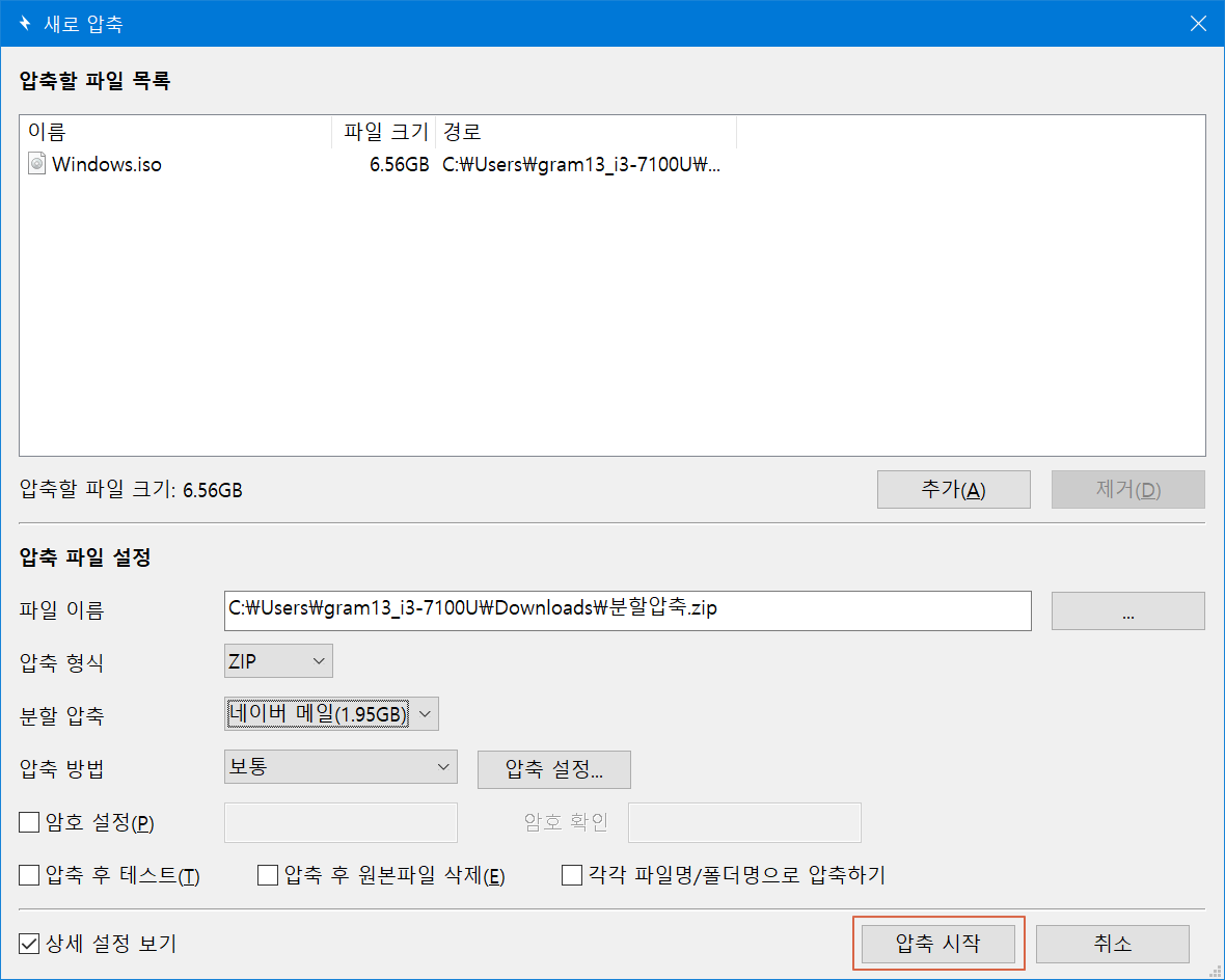 네이버 메일은 2GB 이하의 파일이 첨부가 가능합니다. 총파일의 크기가 6기가를 넘어가므로 <네이버 메일>로 설정하고 <압축 시작>을 누릅니다.