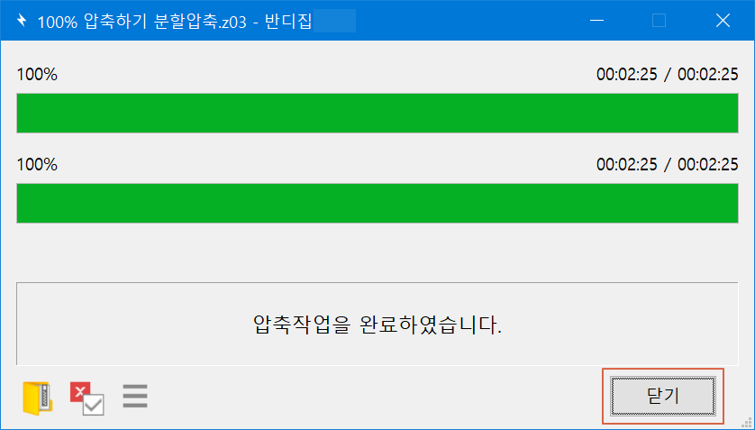 분할 압축 작업이 완료되었습니다. <닫기>를 누르세요.