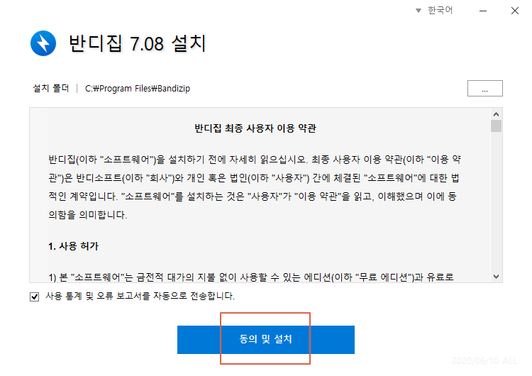 사용자 이용 약관입니다. <동의 및 설치>를 누릅니다.