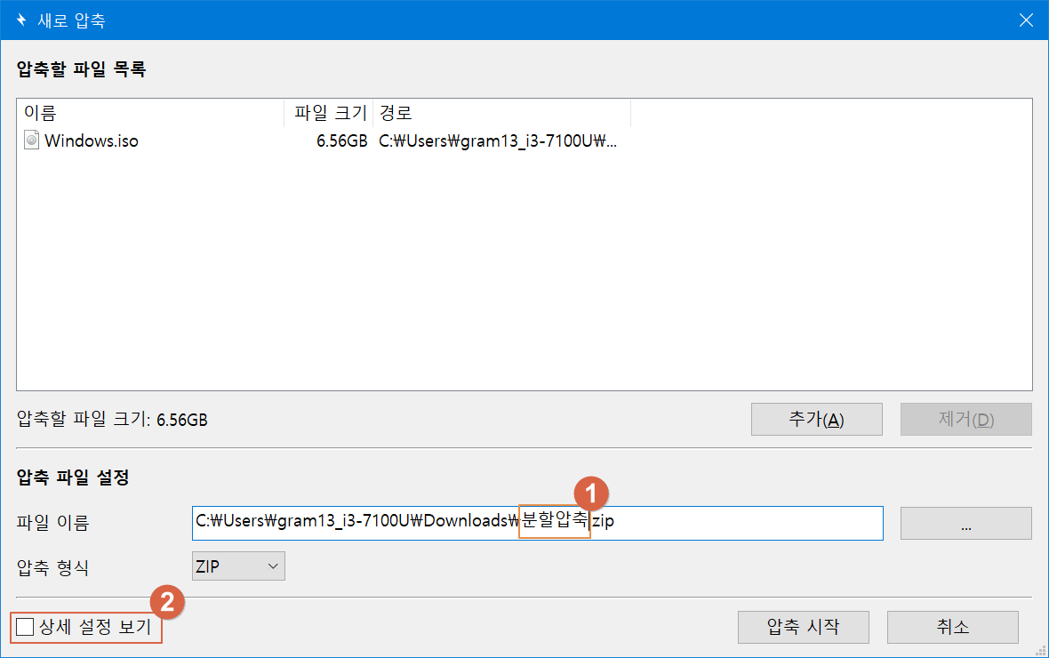 1번 압축될 파일의 이름을 입력하고, 2번 <상세 설정 보기>를 누릅니다.