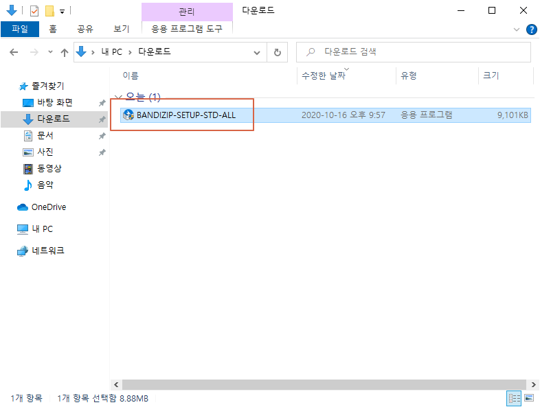 빠르게 다운로드가 진행되어 저장된 경로로 이동하시면 반디집 설치 파일을 확인할 수 있습니다. 설치 파일을 실행합니다.