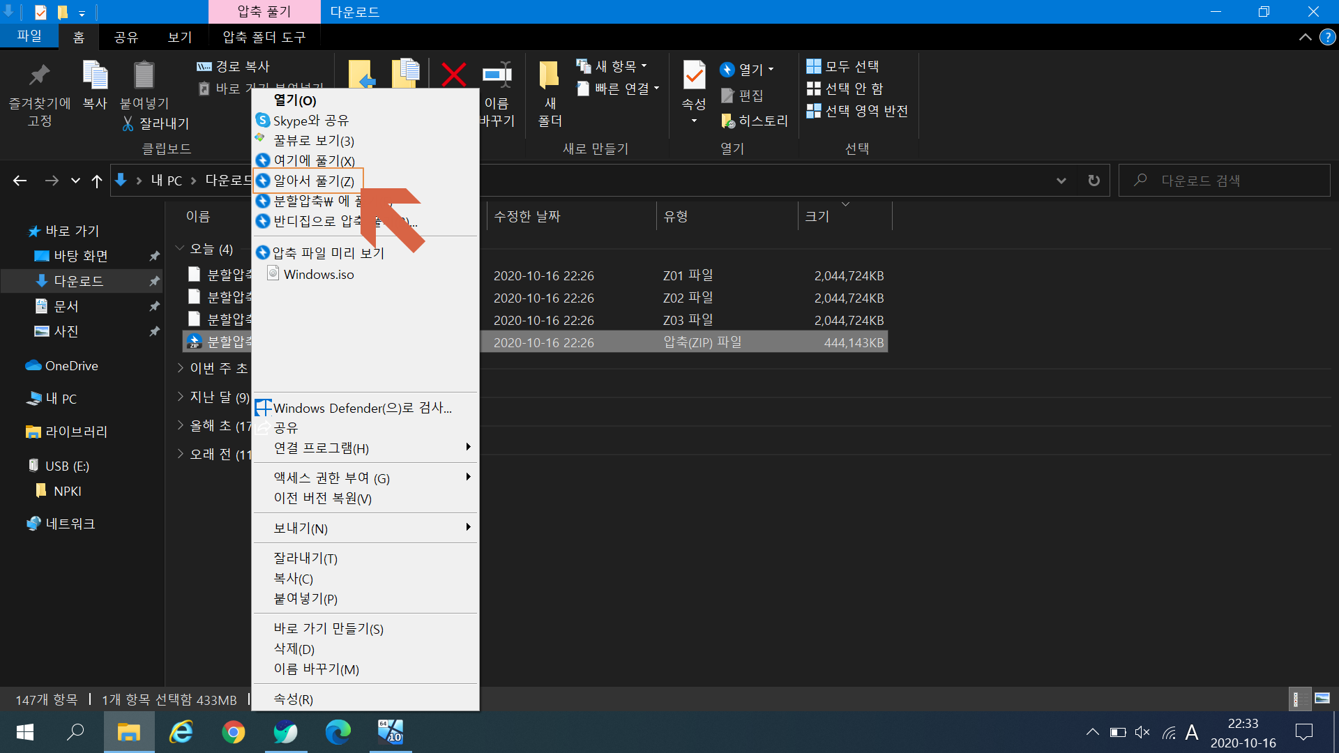 위에서 압축했던 파일들을 분할 압축 풀기를 진행해 보도록 하겠습니다. 압축 풀기 할 파일을 선택합니다.