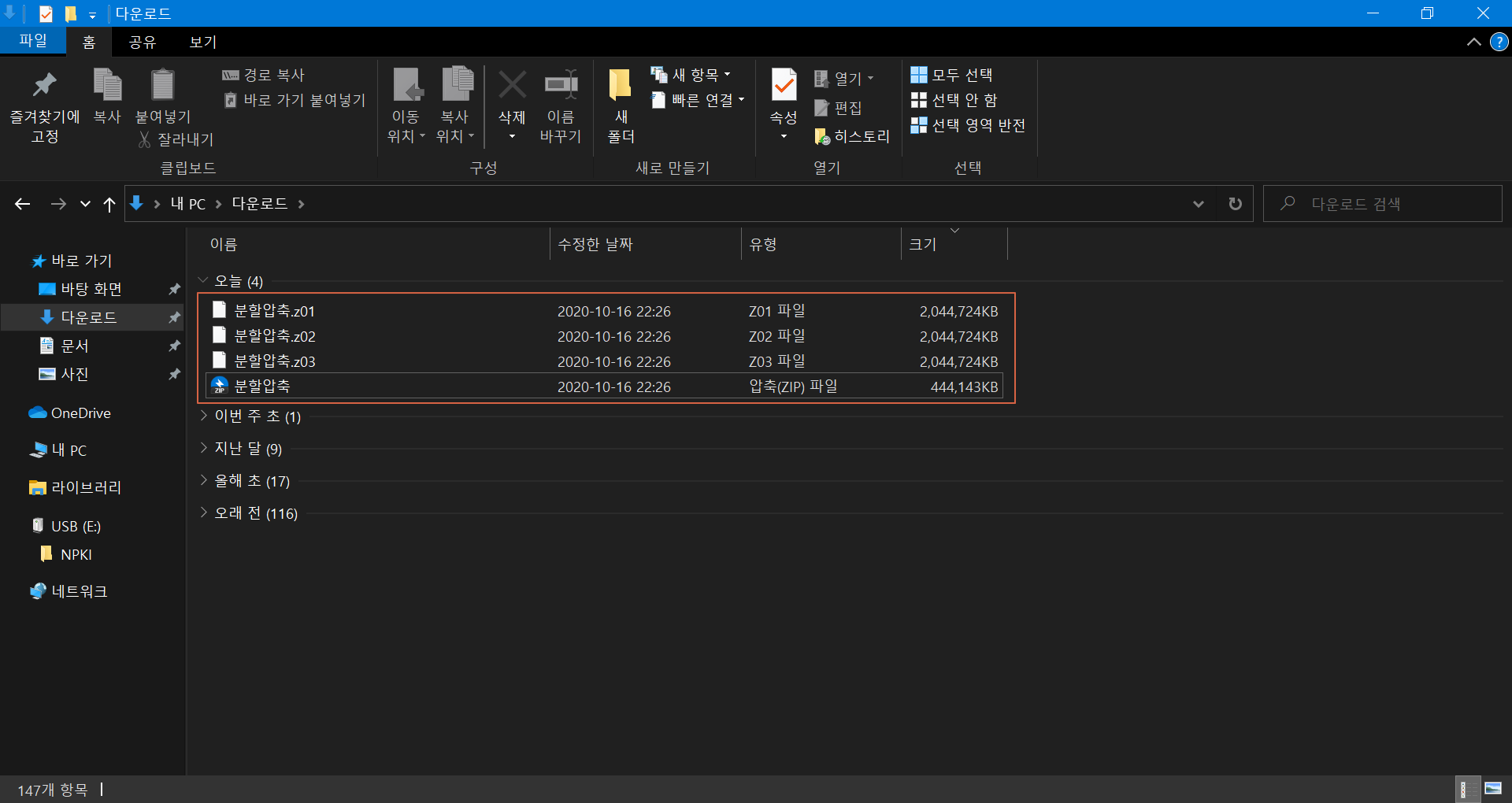압축된 파일이 보입니다. 1.95GB로 분할되어 총 4개의 압축 파일로 분할 압축이 되었습니다.