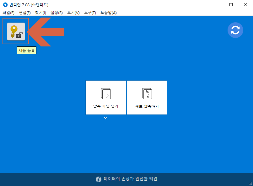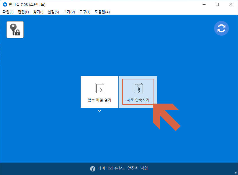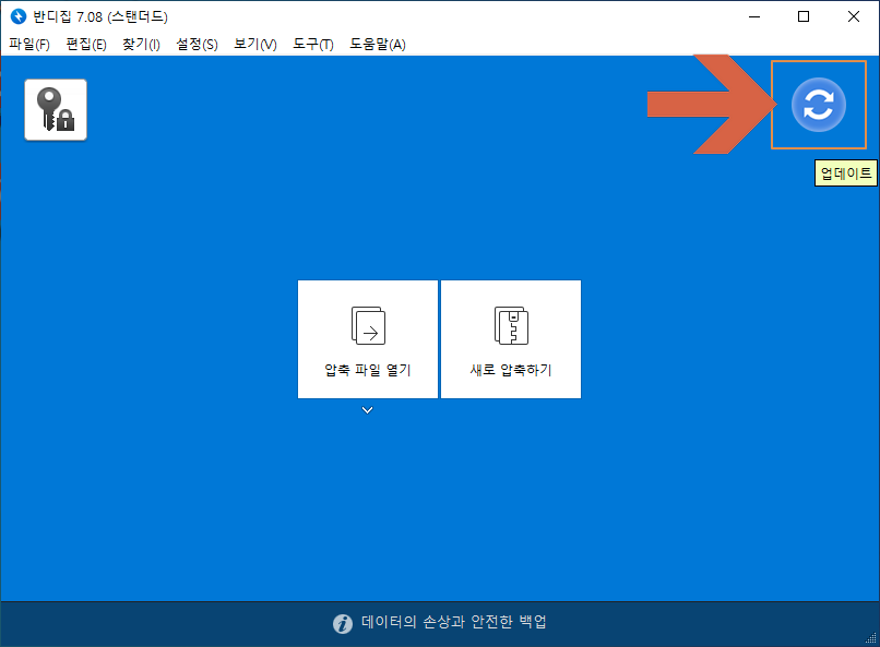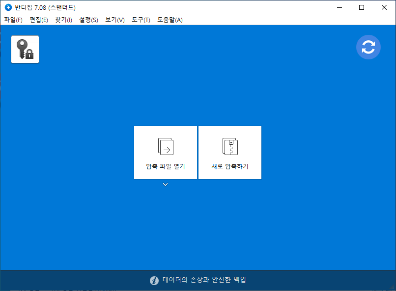 반디집이 실행되었습니다. 이전 버전과는 조금 다른 모습인 듯합니다. 상단에 자물쇠와 열쇠 모양의 아이콘이 생겼습니다.