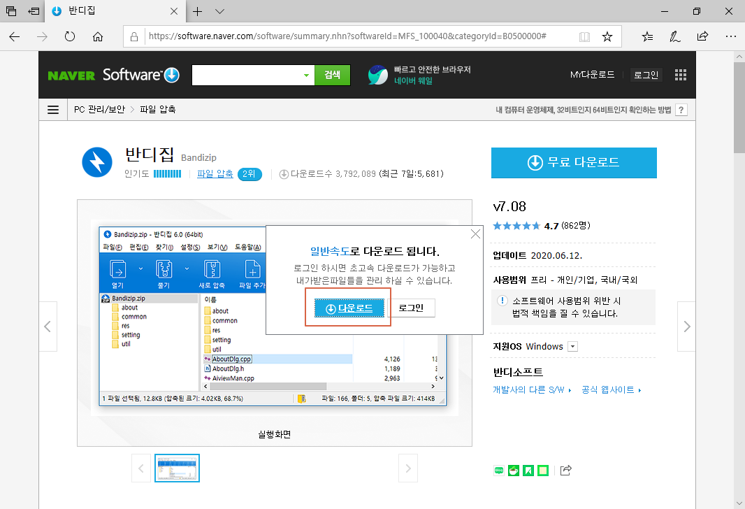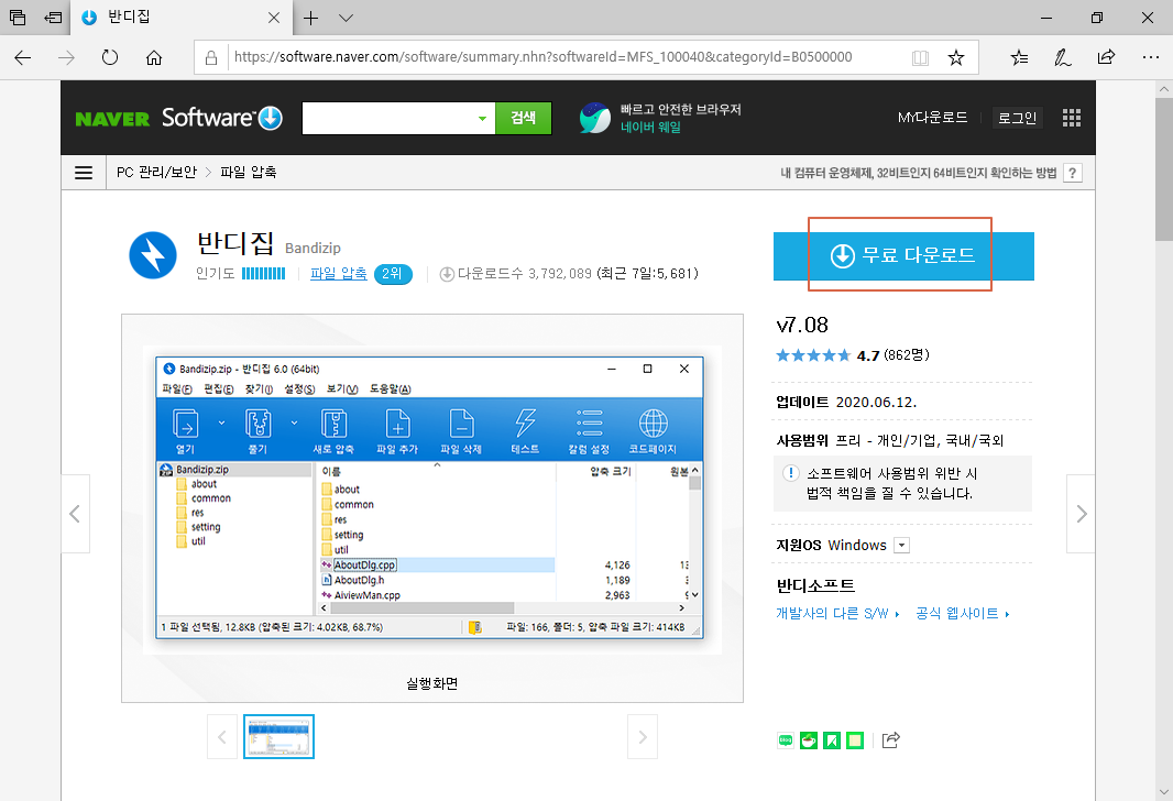 네이버 소프트웨어의 반디집 다운로드 페이지로 이동합니다. <무료 다운로드>를 선택합니다.