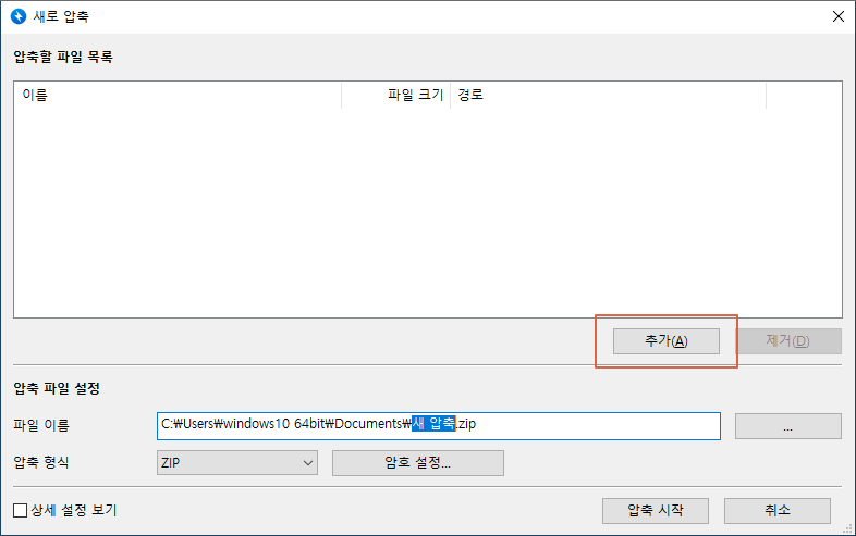 새로 압축 창이 열리면 <추가>를 눌러줍니다.