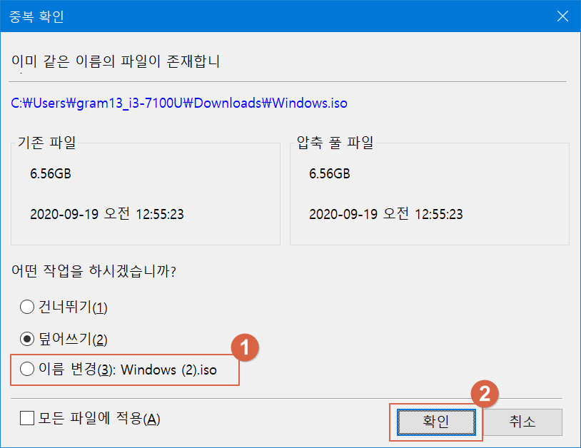 동일한 폴더에 이미 같은 이름의 파일이 있다고 나옵니다. 이럴 때는 덮어쓰기보다는 이름 변경이 유리할 수 있으므로 1번 <이름 변경>에 체크한 후 2번 <확인>을 누릅니다.