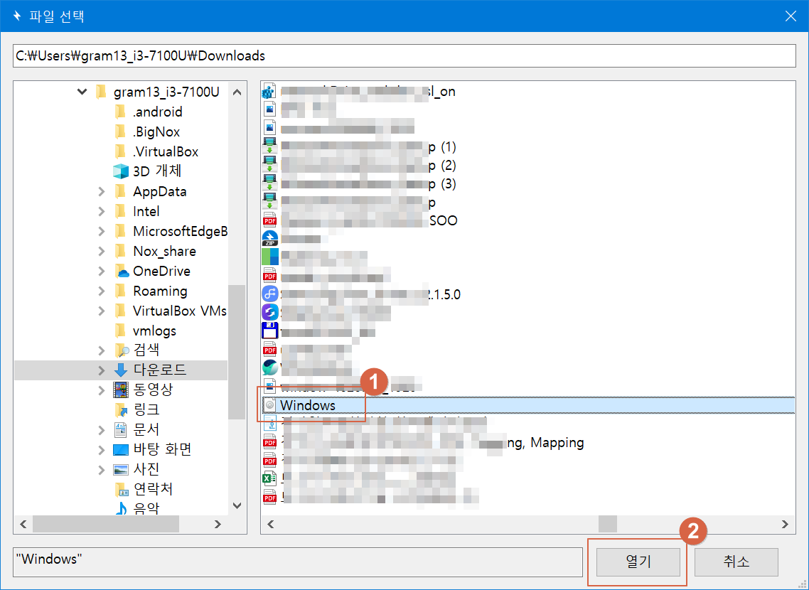 1번 압축할 파일을 선택하고, 2번 <열기>를 누릅니다.