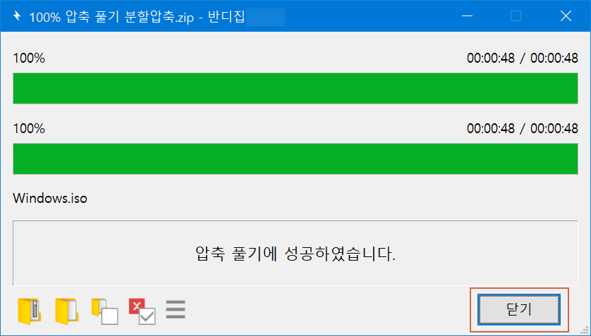 분할된 압축 파일의 압축 풀기가 완료되었습니다. <닫기>를 누릅니다.