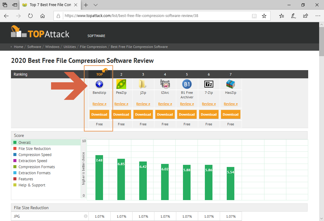 무료 압축 프로그램인 반디집은 TopAttack Software의 2020년 최고의 무료 압축 소프트웨어로 선정되었으며, 랭킹을 살펴보면 역시 많은 사용자를 확보하고 있는 7-zip도 6위에 랭크되어있습니다.