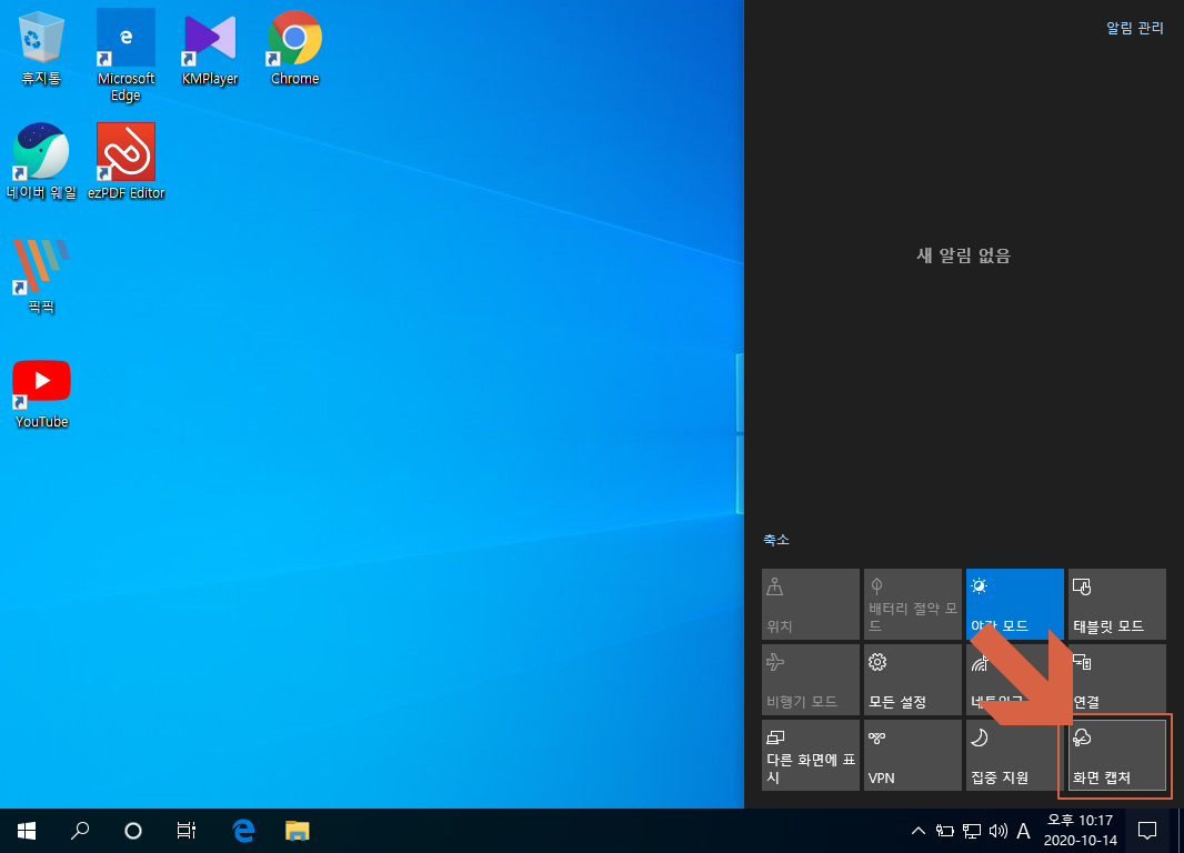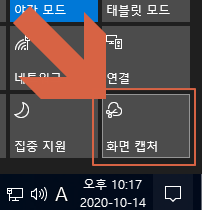 윈도우10 알림 센터의 클릭하면 화면캡쳐 기능이 나타납니다.