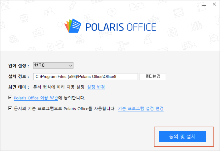 <동의 및 설치>를 누릅니다. 만약 문서의 기본 프로그램으로 폴라리스 오피스를 사용하지 않으시려면 <문서의 기본 프로그램으로 Polaris Office를 사용합니다>에서 체크를 해제하신 후 <동의 및 설치>를 선택하시면 됩니다.