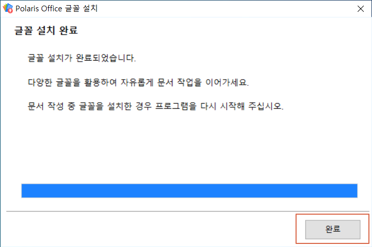 <완료>를 누릅니다. 노트북 등의 기기를 사용하여 저장 공간이 부족하다면 <글꼴 추가 설치하기>는 체크 해제하고 완료를 누르셔도 됩니다. 하지만 폰트를 추가 설치하는 것이 사용하는데 편리하게 작용합니다.