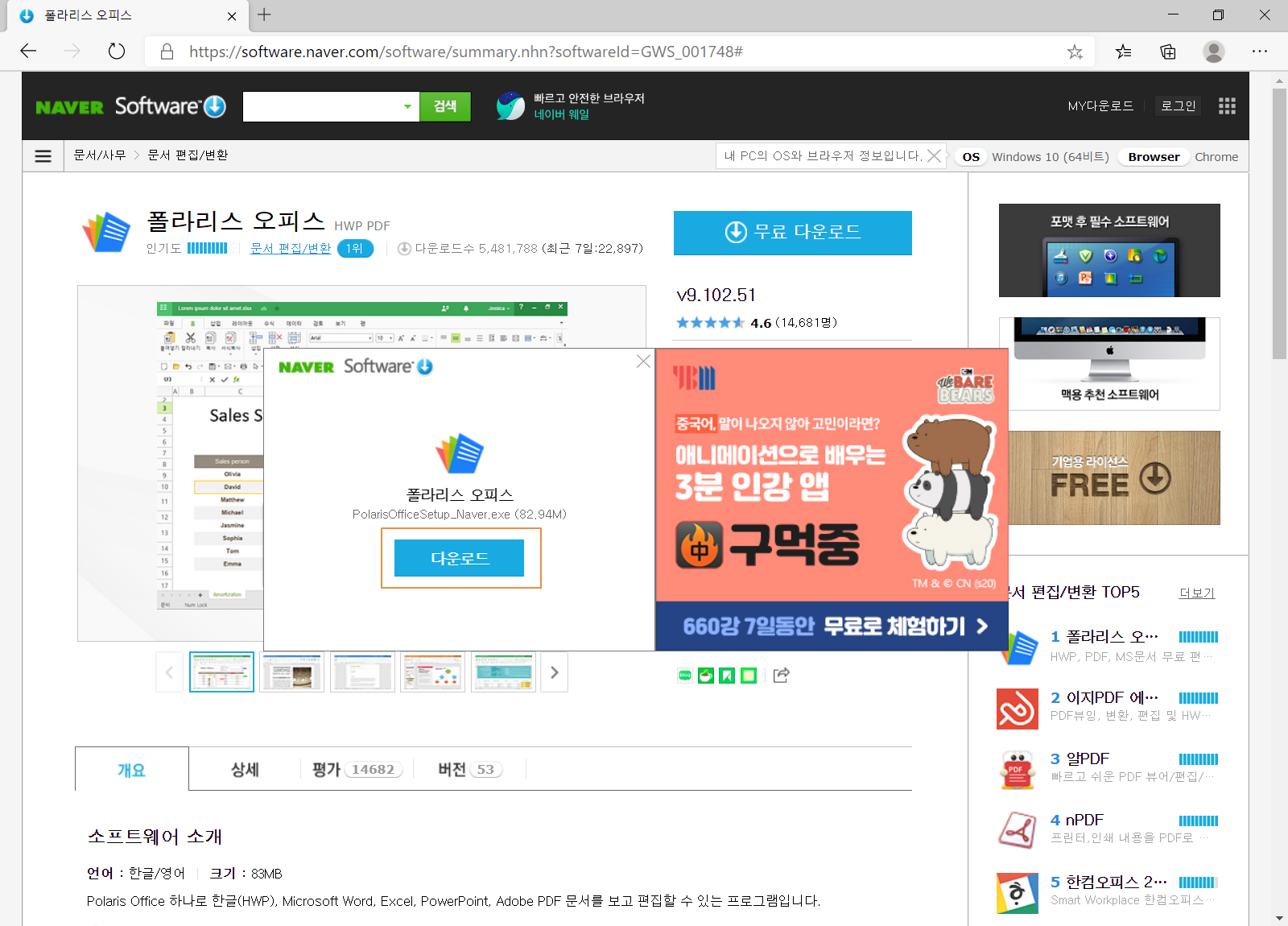 지금까지 폴라리스 오피스를 다운로드하여 설치하기를 정리해 보았습니다. HWP와 PDF 무료 편집 프로그램으로 네이버 소프트웨어 자료실 문서/사무 부분의 문서 편집/변환 카테고리에서 1위를 달리고 있습니다. 폴라리스 오피스는 완성도가 높고 사용이 편리하기 때문일 듯합니다.