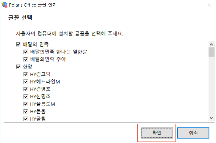 <확인>을 누릅니다. 배달의 민족, 한양, 산돌, 나눔, 폴라리스, 릭스, 서울 남산체 등의 총 72개의 글꼴이 설치되는데 설치 글꼴을 선택하여 제외하는 것도 가능합니다.