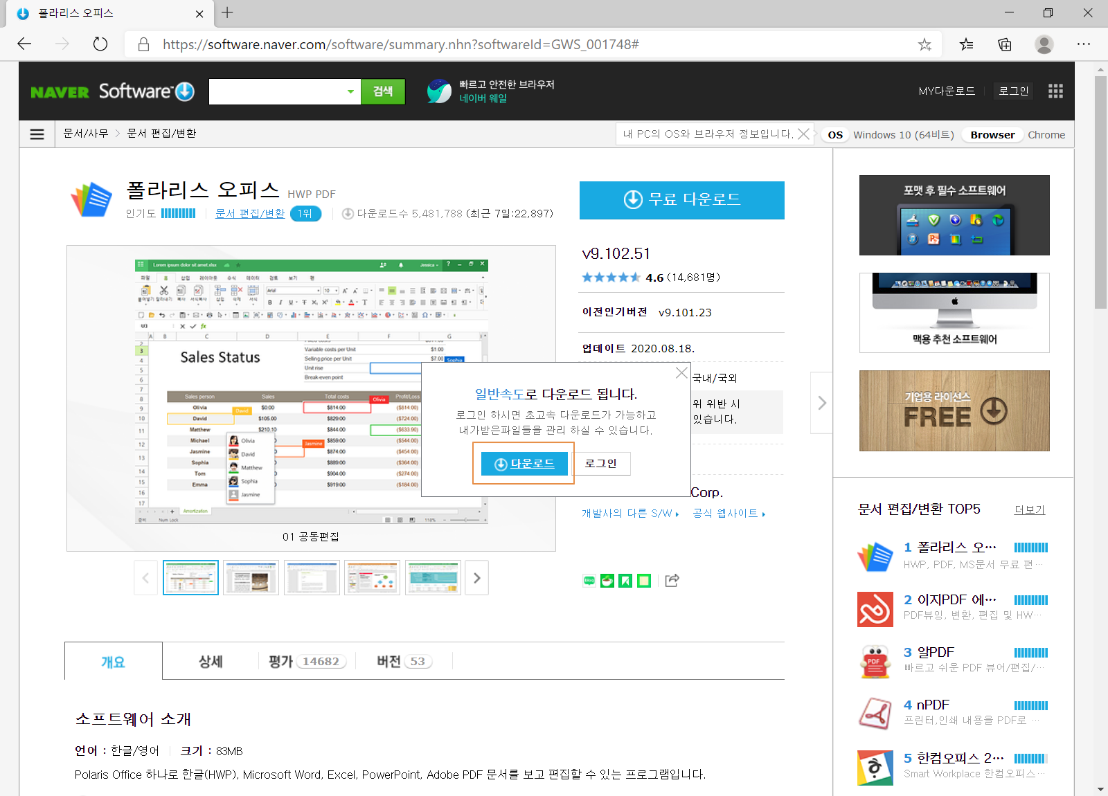 네이버 소프트웨어의 폴라리스 오피스(Polaris Office) 다운로드 페이지로 접속하여, <무료 다운로드>를 누릅니다.