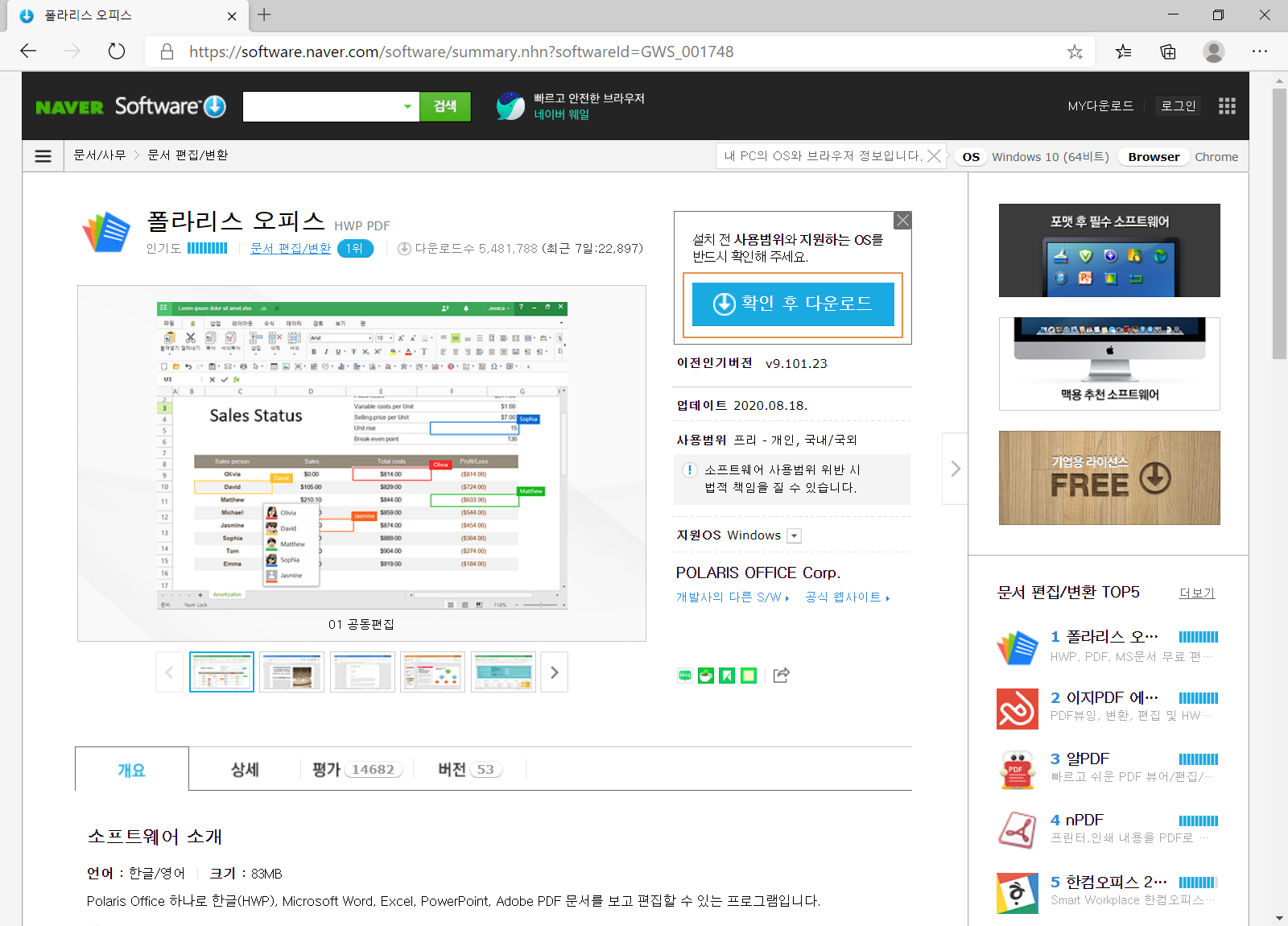 지금까지 폴라리스 오피스를 다운로드하여 설치하기를 정리해 보았습니다. HWP와 PDF 무료 편집 프로그램으로 네이버 소프트웨어 자료실 문서/사무 부분의 문서 편집/변환 카테고리에서 1위를 달리고 있습니다. 폴라리스 오피스는 완성도가 높고 사용이 편리하기 때문일 듯합니다.