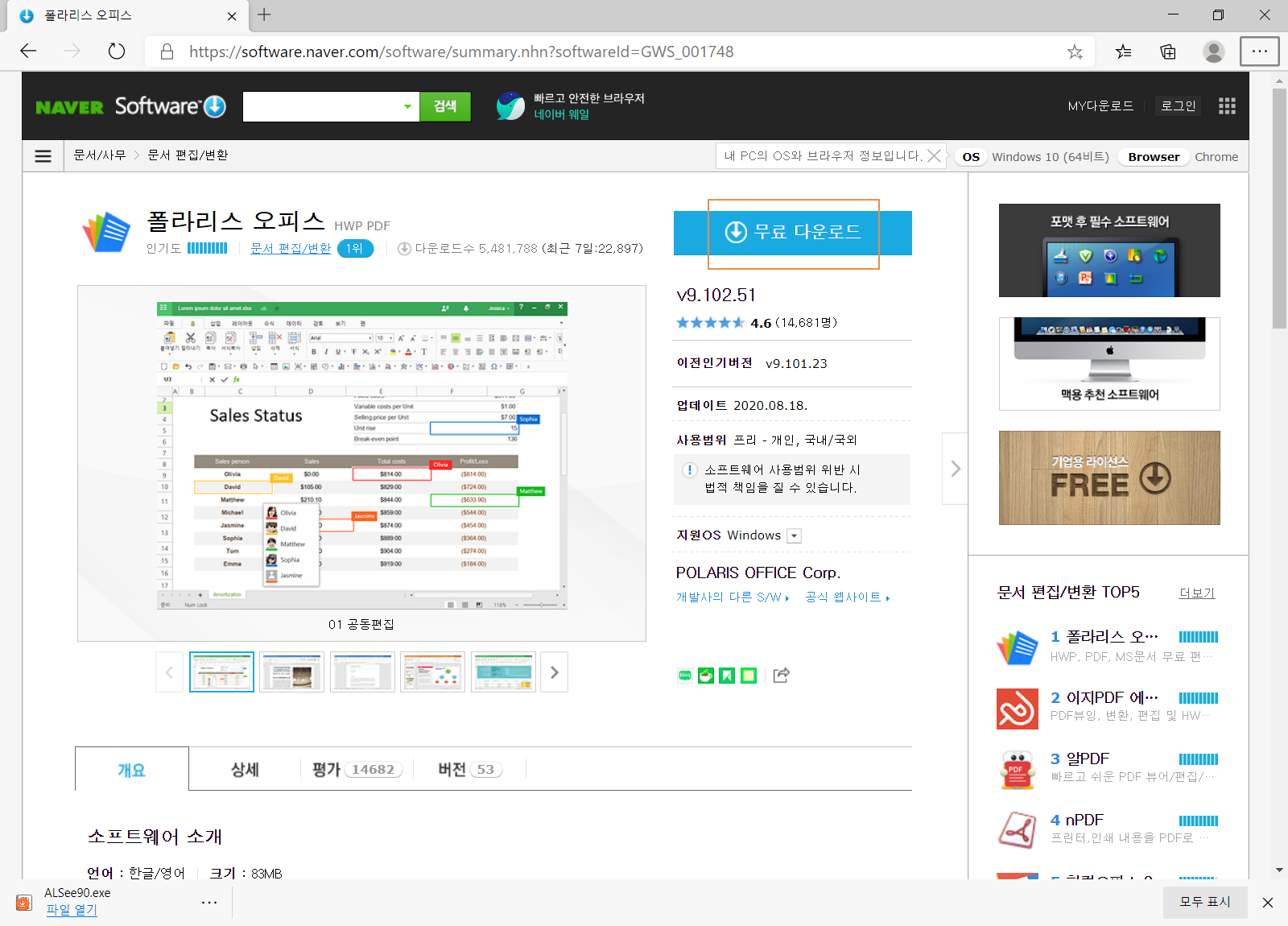네이버 소프트웨어의 폴라리스 오피스(Polaris Office) 다운로드 페이지로 접속하여, <무료 다운로드>를 누릅니다.