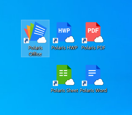 폴라리스 오피스를 설치하면 폴라리스 오피스, 폴라리스 HWP, 폴라리스 PDF, 엑셀류의 스프레드시트 프로그램인 폴라리스 시트, 워드 프로그램인 폴라리스 워드의 바로가기 아이콘이 생성됩니다.