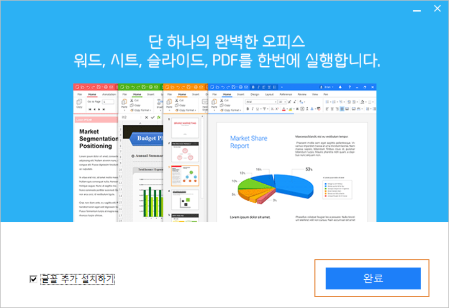 <완료>를 누릅니다. 노트북 등의 기기를 사용하여 저장 공간이 부족하다면 <글꼴 추가 설치하기>는 체크 해제하고 완료를 누르셔도 됩니다. 하지만 폰트를 추가 설치하는 것이 사용하는데 편리하게 작용합니다.