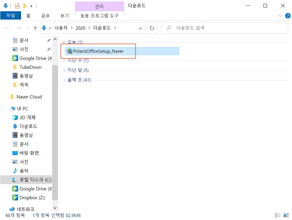 내려받기가 완료되면 다운로드 경로로 이동합니다. 폴라리스 오피스 설치 파일을 실행하면 설치가 시작됩니다.