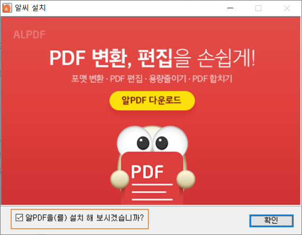 <알PDF을(를) 설치해 보시겠습니까?>에 체크를 해제합니다. 충분히 좋은 프로그램이지만 나중에 추가로 설치가 가능하므로 필요할때 추가 설치를 권해드립니다.