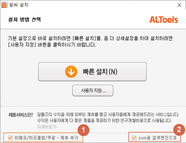 1번 <위메프/하프클럽/쿠팡 - 제휴 추가>를 체크 해제한 후 2번 <zum을 검색엔진으로>도 체크 해제합니다. 시작페이지와 광고가 열리기 때문에 조금 귀찮아질 수 있어 제외하도록 합니다.
