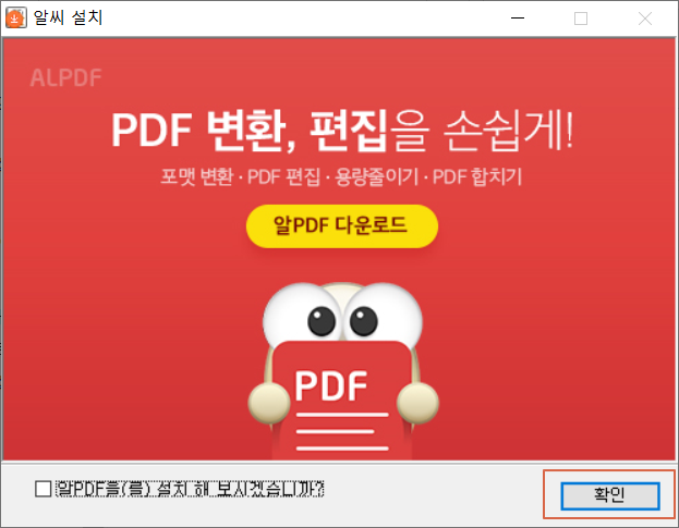 <알PDF을(를) 설치해 보시겠습니까?>에 체크를 해제합니다. 충분히 좋은 프로그램이지만 나중에 추가로 설치가 가능하므로 필요할때 추가 설치를 권해드립니다.