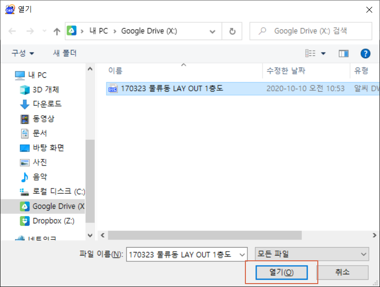 캐드 도면 파일을 선택 후 <열기>를 누릅니다.