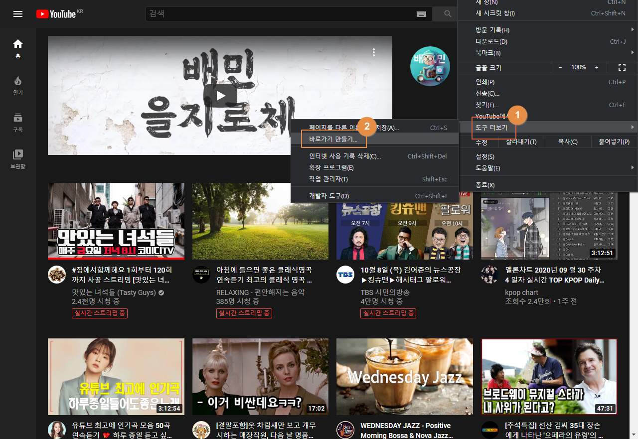 구글 크롬(Chrome)의 도구 기능에 열려있는 페이지의 바로가기 단축 아이콘 생성 기능을 활용하므로 생각보다 간단하고 쉬운 방안이라서 유튜브 바로가기를 만들어 놓으면 다음부터는 간편하고 빠르게 유튜브로 접속이 가능합니다.