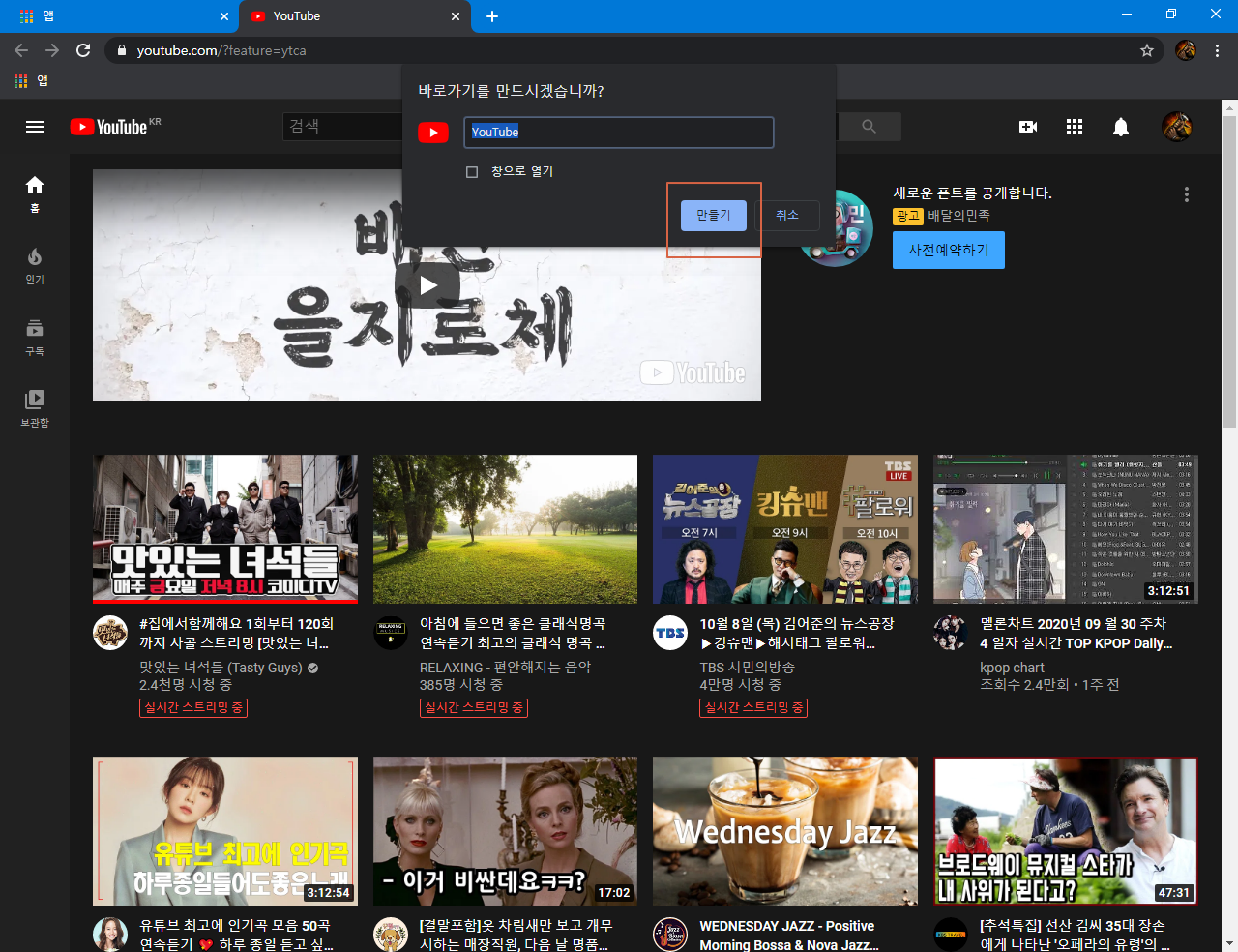 유튜브 바로가기, 구글 크롬(Chrome) 유튜브 바로가기 만들기