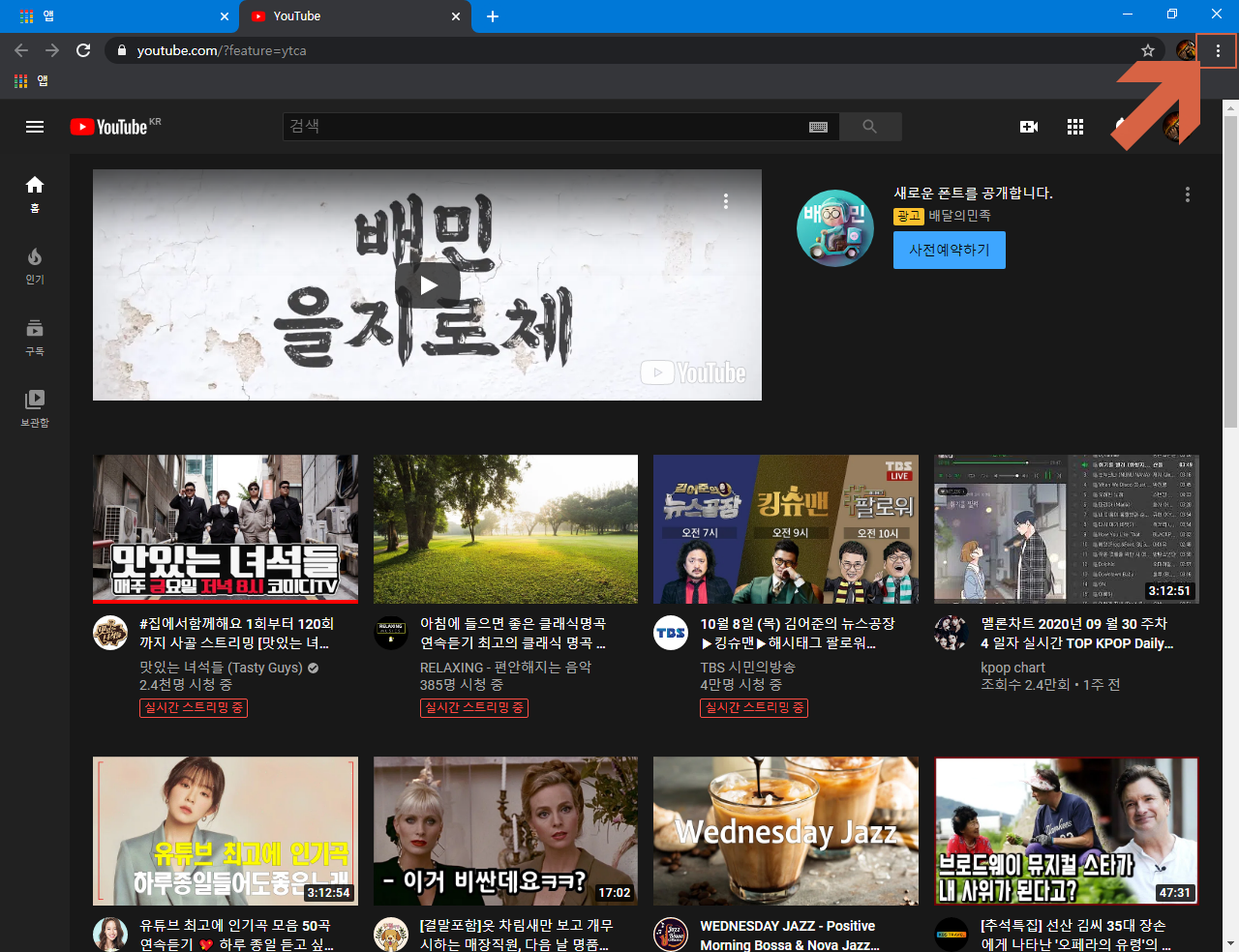 단번에 바탕화면의 유튜브 바로가기 아이콘을 통해서 유튜브 홈페이지에 접속해 보았습니다.