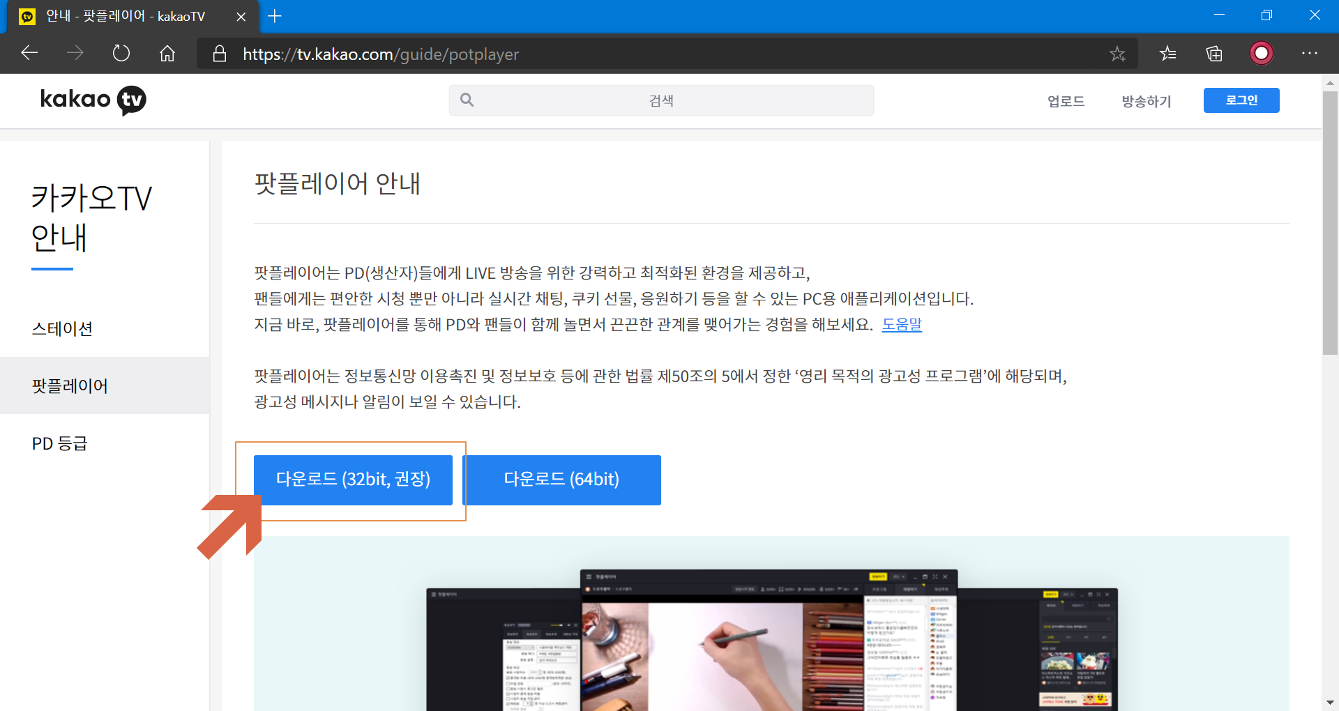 다음팟플레이어가 카카오TV로 변경됨에 따라서 팟플레이어 다운로드 사이트도 변경되었는데요. 변경된 팟플레이어 사이트로 접속합니다. <다운로드(32bit), 권장>을 누릅니다.