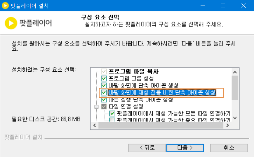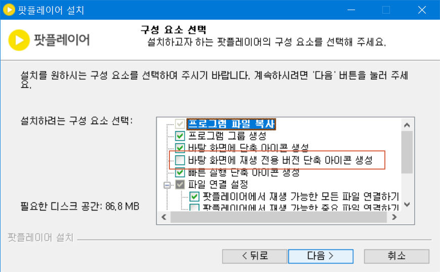 <바탕화면에 재생 전용 버전 단축 아이콘 생성>에 체크하시면 따로 동영상 플레이어로만 사용할 수 있는 다음팟플레이어 시절에는 미니라고 불리우던 라이브 버전 기능만이 빠진 프로그램을 쉽게 실행할 수 있습니다.
