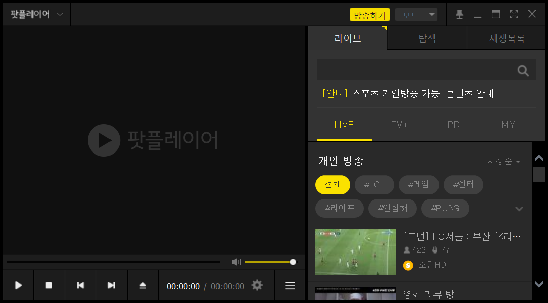다음팟플레이어가 실행되었습니다. 참 다음은 빠진 팟플레이어가 실행되었습니다. 대신에 다음팟이 아닌 카카오TV 라이브가 옆에 실행됩니다. 상단에 방송하기 버튼도 있어 로그인 후 실시간 방송도 가능합니다.