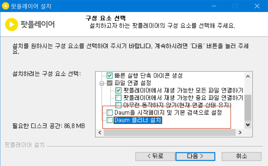 시작페이지를 변경하거나 다음 클리너 설치는 필요하면 나중에 추가로 하여도 가능하므로 깨끗하게 다음팟플레이어를 설치하기 위해서는 체크를 해제한 후 다음으로 진행합니다.