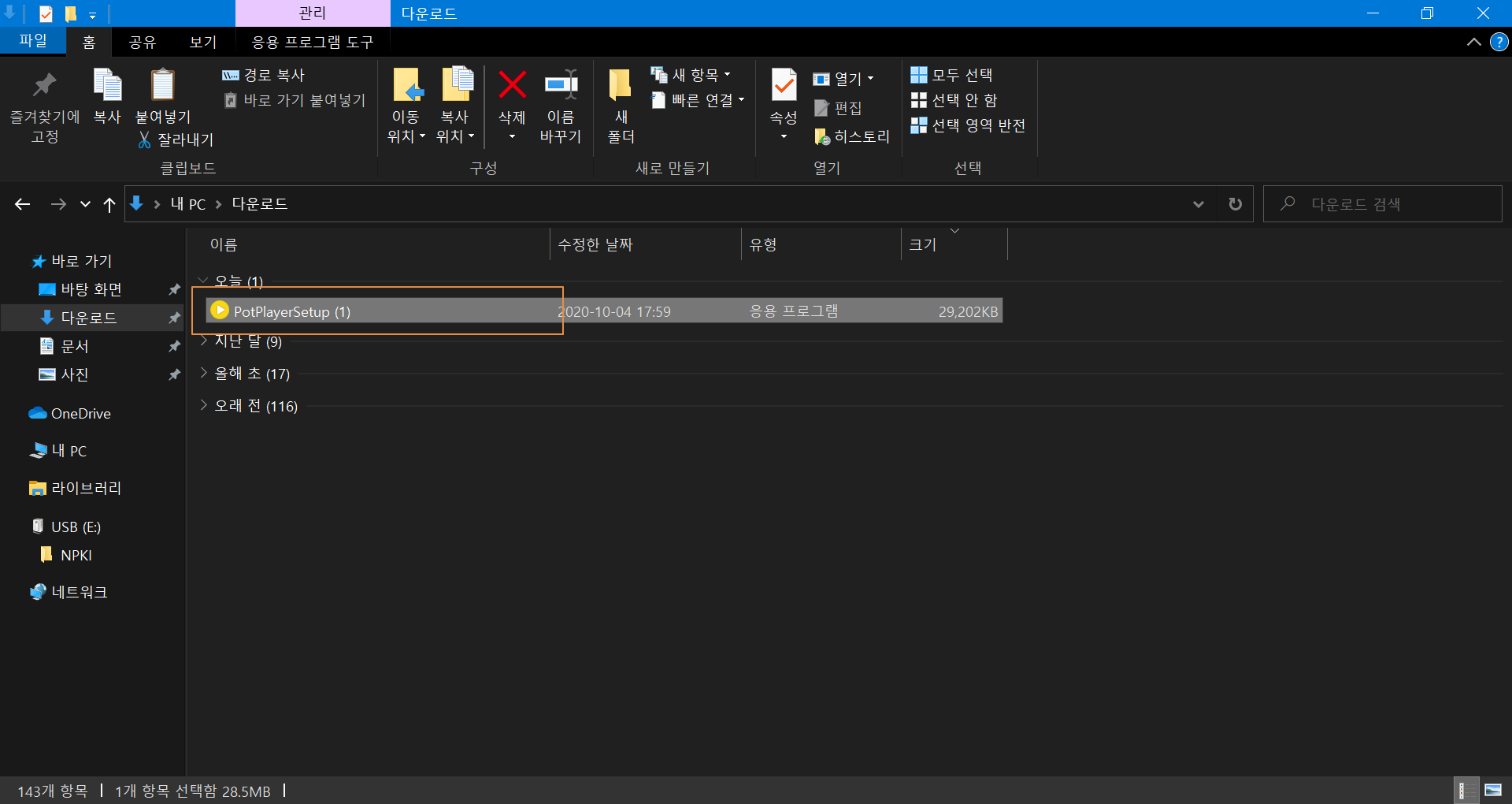 다운로드가 완료되면 내려받은 폴더로 이동합니다. 다음 팟플레이어의 설치 파일을 실행합니다.