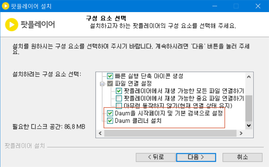 다음팟플레이어를 설치하게되면 이전에는 무조건 선택이 되어서 자동으로 변경되던 시기도 있었지만 이제는 사용자가 선택할 수 있도록 되어있습니다. <Daum을 시작페이지 및 기본 검색으로 설정>에 체크를 해제하며, <Daum 클리너 설치>에도 체크를 해제합니다.