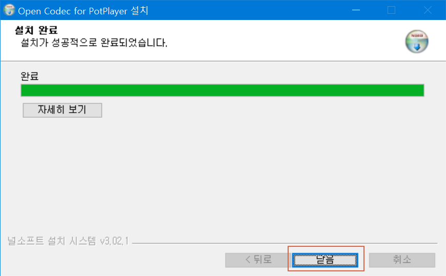 설치가 완료되었습니다. <닫음>을 누릅니다.