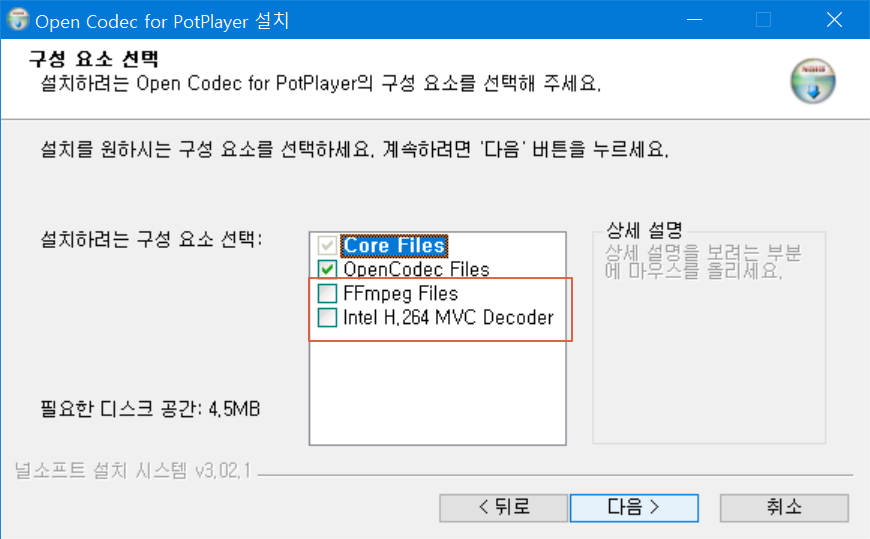 이왕 설치하는것이니 OpenCodec Files외에 FFmpeg Files 및 Intel H.264 MVC Decoder까지 체크하시는게 좋습니다.