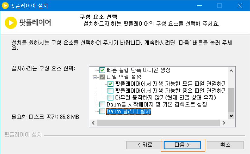 시작페이지를 변경하거나 다음 클리너 설치는 필요하면 나중에 추가로 하여도 가능하므로 깨끗하게 다음팟플레이어를 설치하기 위해서는 체크를 해제한 후 다음으로 진행합니다.