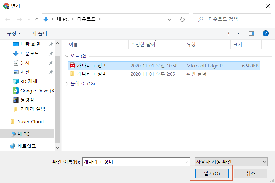 PDF 용량 줄이기 할 PDF 파일을 선택 후 <열기>를 누릅니다.