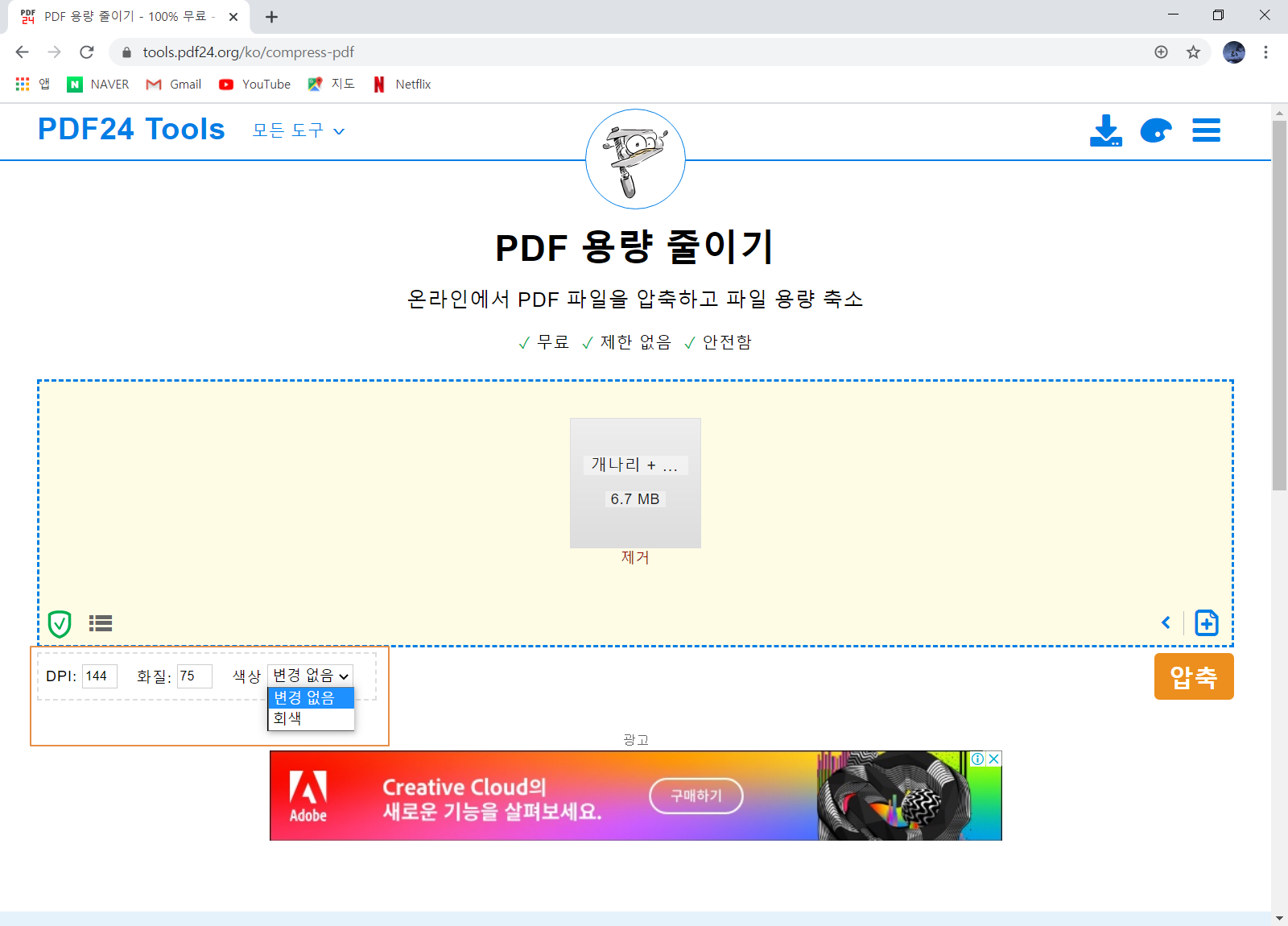 1번 색상을 회색으로 설정하고, 2번 <압축>을 누릅니다. 컬러를 흑백으로 변경하면 파일 용량이 많이 줄어들 수 있지만 필요에 따라서는 DPI나 화질을 줄여서 용량을 원하는 수준으로 줄이기 할 수 있습니다.