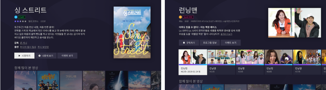 넷플릭스와 유사한 느낌을 갖지만 조금 더 우리나라의 콘텐츠에 집중된 모습이라고 보는게 좋을듯 합니다. 실시간 뉴스나 방송 채널을 시청할 수 있기때문에 유용합니다.