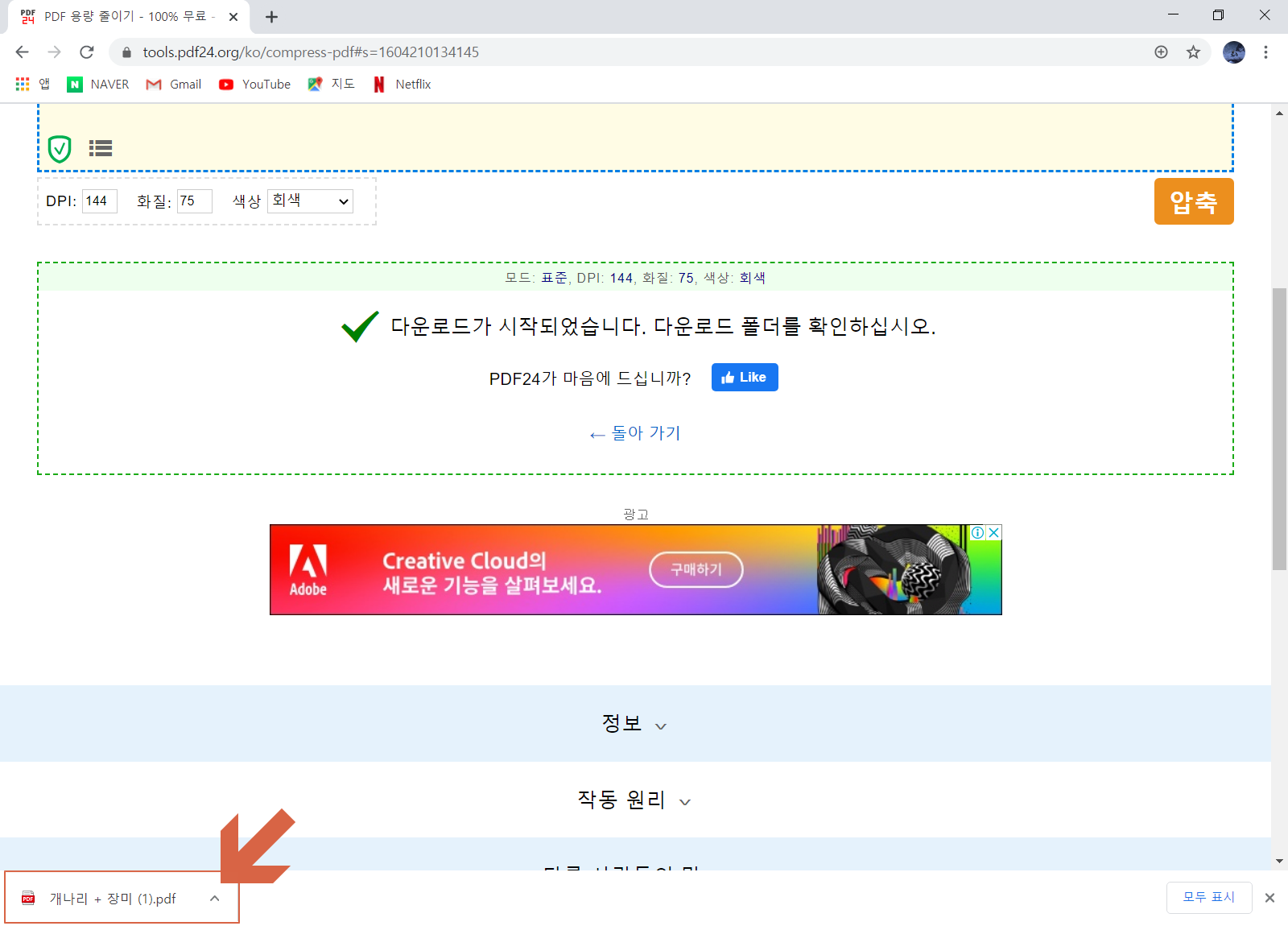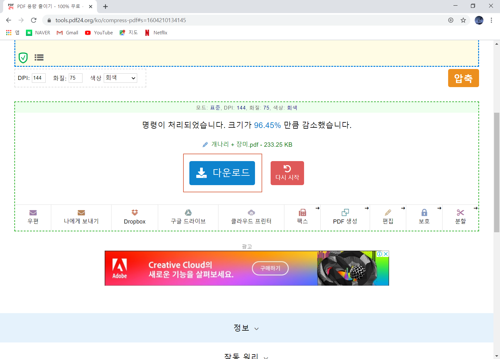 PDF 파일 크기가 96.45%가 줄어들었습니다. 용량 줄이기가 처리 완료되었습니다. <다운로드>를 누릅니다.