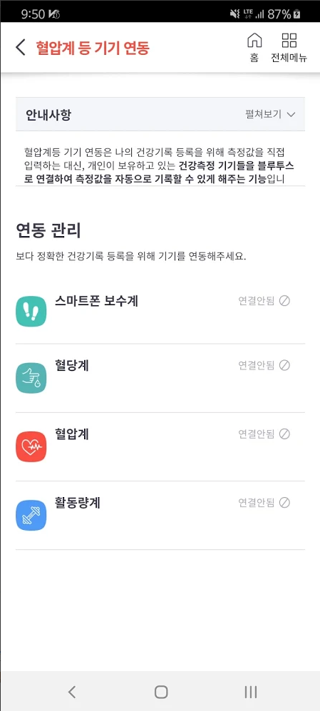 - 블루투스: 혈압, 혈당, 걸음 수 데이터를 등록하기 위해 사용합니다.