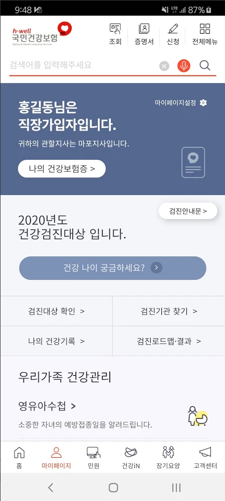 - 마이페이지에서 나의 건강보험 정보를 한눈에 확인하고, 나의 맞춤메뉴를 설정하여 나만의 모바일앱으로 사용할 수 있습니다.