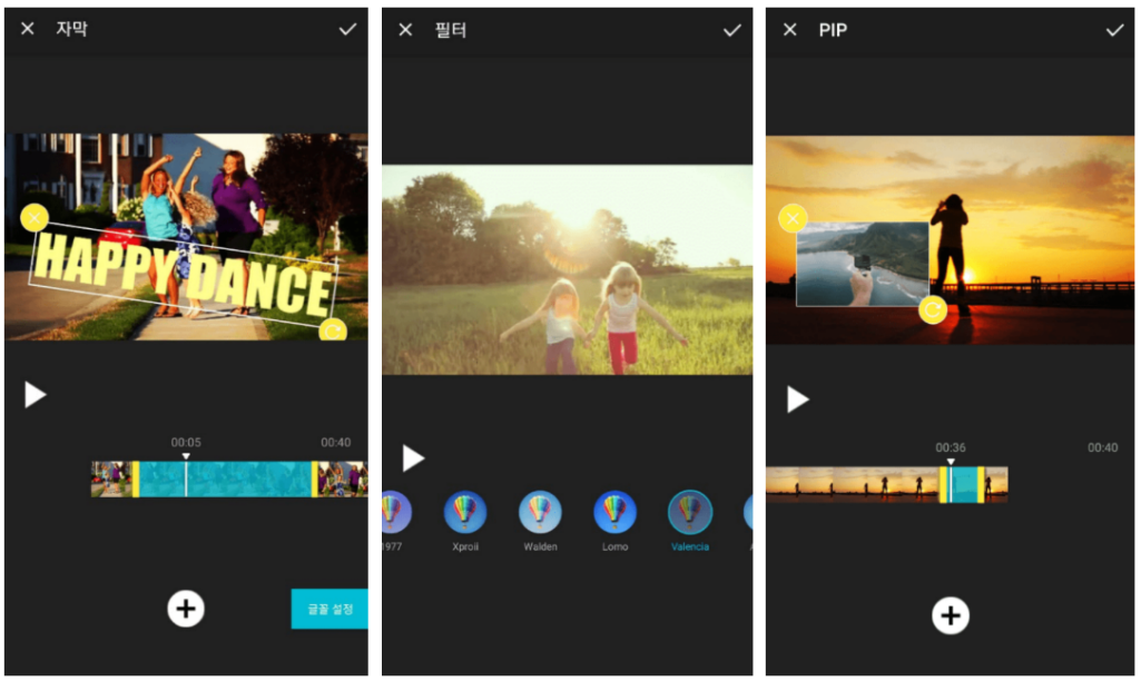 간단하지만 강력한 동영상 편집기, 안드로이드 기기에서 비디오 편집이 쉽게 진행할 수 있으며, 새로운 기능으로 이미지 슬라이드 쇼 제작에 회전이 가능하고 이 기능을 지원하는 최초의 앱이라고 합니다.