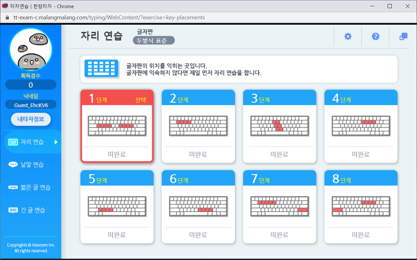 첫번째 메뉴인 자리 연습입니다. 글자판의 위치를 익히는 곳입니다. 글자판에 익숙하지 않다면 제일 먼저 자리 연습을 합니다.