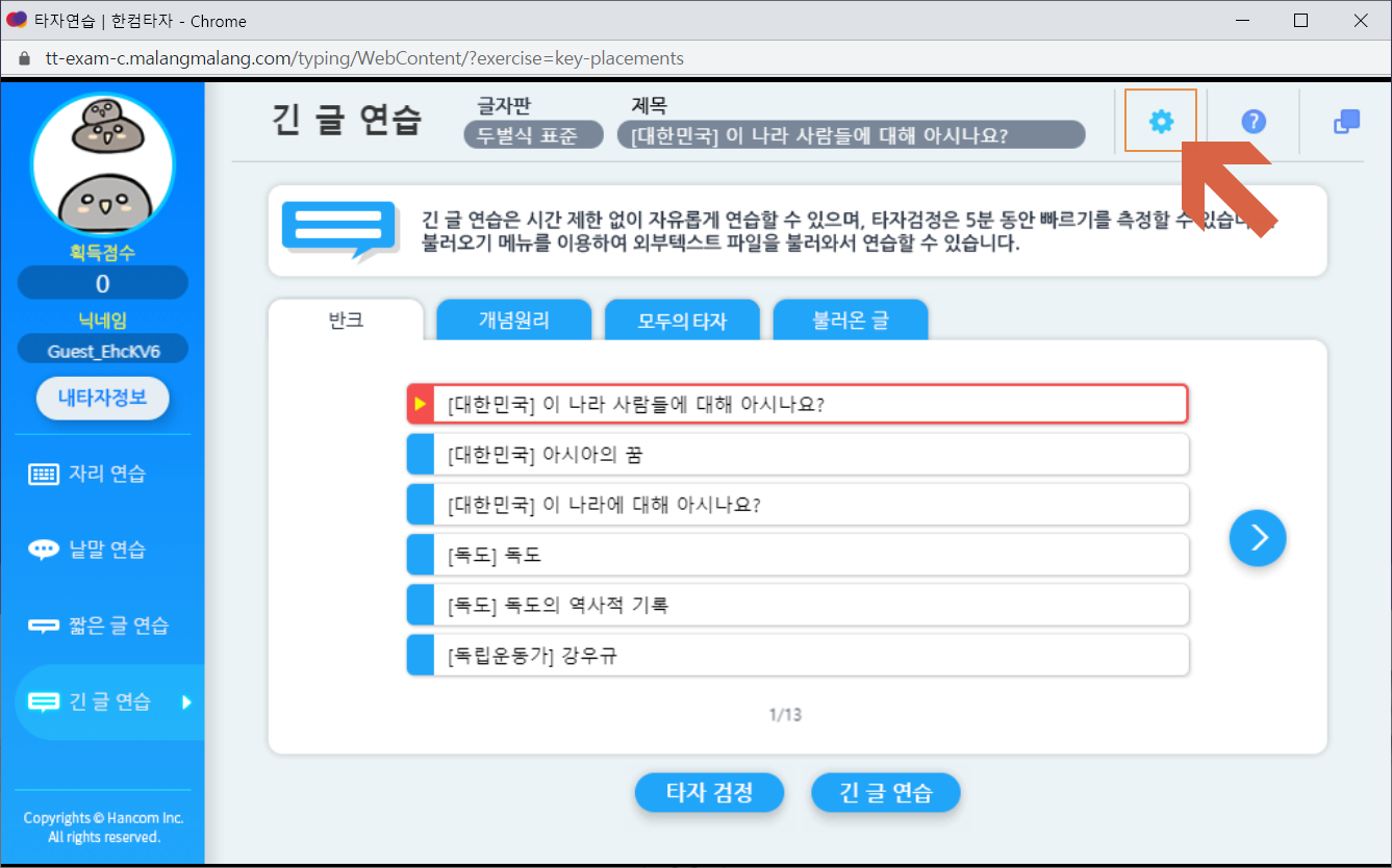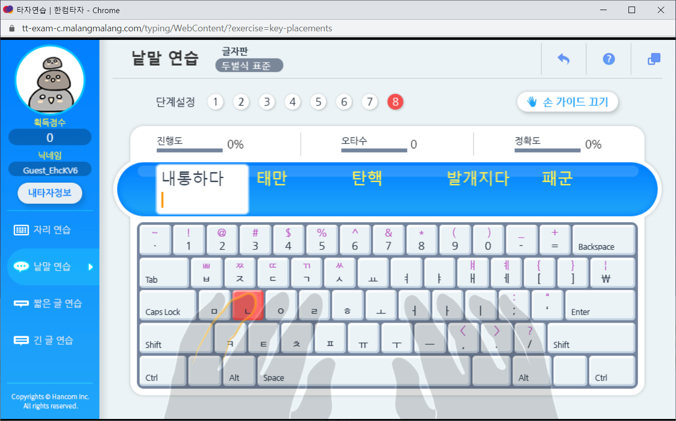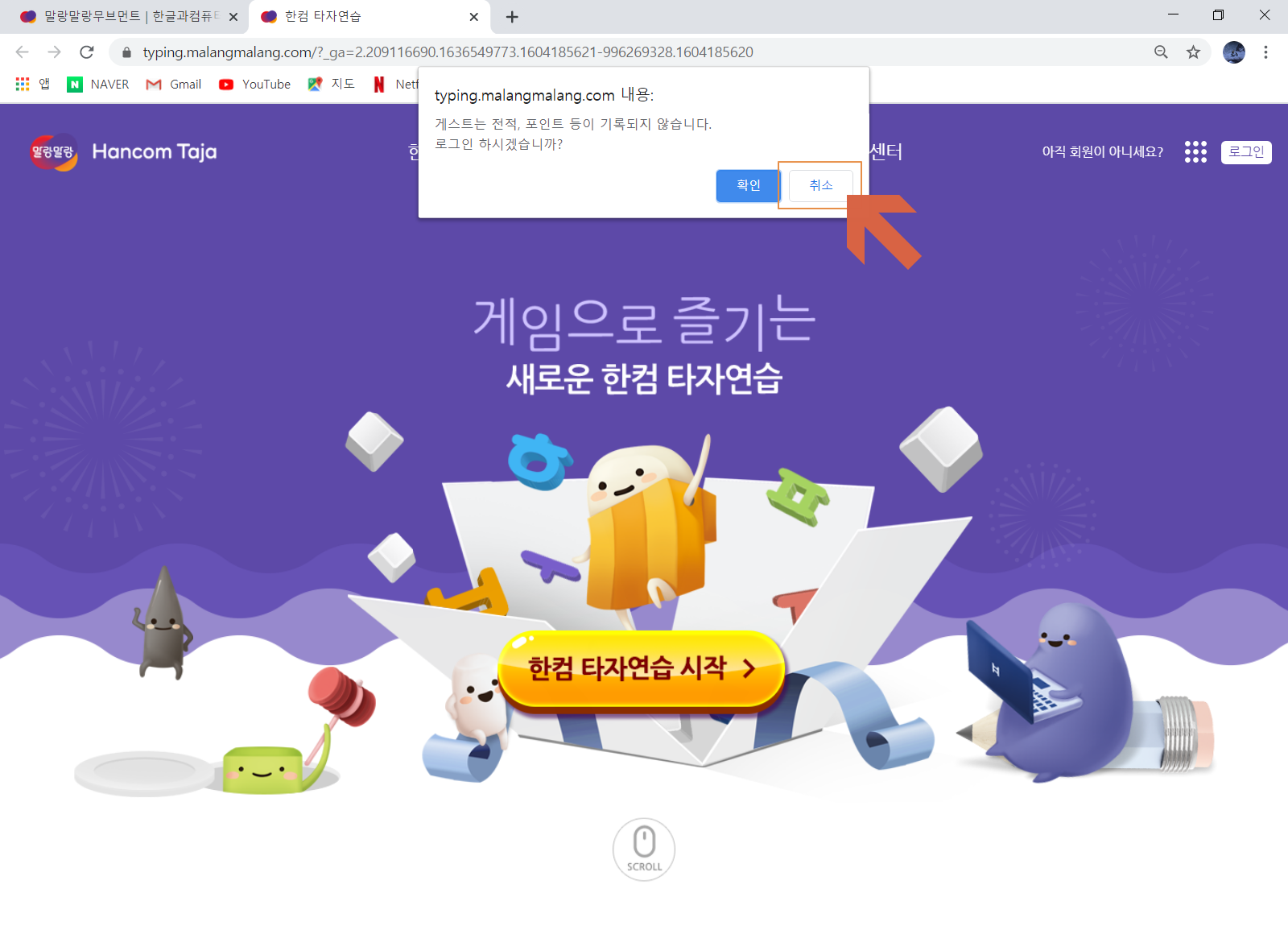 로그인하면 전적, 포인트 등이 기록되어 타자연습 기록을 모니터링할 수 있어 발전되는 모습을 확인할 수 있습니다만, 회원가입이 번거롭고 기록을 확인하면서 연습할 계획이 아니라면 게스트로 접속하는 것도 나쁘지 않습니다. 게스트로 접속하려면 <취소>를 누릅니다.